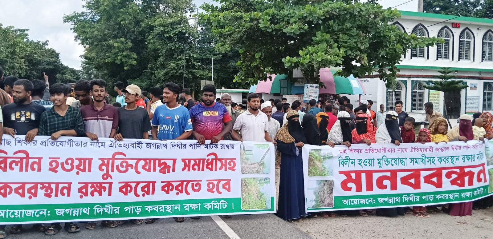 কুমিল্লা: কুমিল্লার চৌদ্দগ্রামে মাছ শিকার প্রতিযোগিতার নামে অবৈধভাবে ঐতিহ্যবাহী জগন্নাথদীঘির পানি আটকে রাখার প্রতিবাদে ও ৭১ এর স্বাধীনতা যুদ্ধে শহীদ হওয়া বীর মুক্তিযোদ্ধাদের স্মৃতি বিজড়িত সমাধীস্থল এবং শতবছরের পুরনো দীঘির পাড়স্থ ঐতিহ্যবাহী স্থানীয় কবরস্থান রক্ষার দাবিতে মানববন্ধন করেছে বিক্ষুব্ধ এলাকাবাসী। পরে যৌক্তিক দাবি আদায়ের লক্ষ্যে উপজেলা প্রশাসনের হস্তক্ষেপ কামনায় মহাসড়কে একটি বিক্ষোভ মিছিল করে স্থানীয়রা।